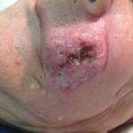 CLINICAL HISTORY: A 91-year-old gentleman with a history of hypertension, gastroesophageal reflux disease, and vitiligo presented to the clinic with two large violaceous ulcerated plaques on his left lower leg. The patient stated that a papule had formed four months prior after a ground-level fall, and it had continued to grow over the last few months, starting to bleed within a few weeks of his appointment. He denied experiencing pain, itchiness, fatigue, or other B symptoms, such as fever, weight loss, or night sweats. The patient also denied recent travel, smoking, using illicit drugs, drinking alcohol, or taking any new medications. His family history was notable for a deceased brother who had an unknown type of cancer. Current medications included carvedilol, doxazosin mesylate, isosorbide mononitrate, omeprazole, loratadine, clopidogrel bisulfate, losartan, benzonatate, and folic acid.
