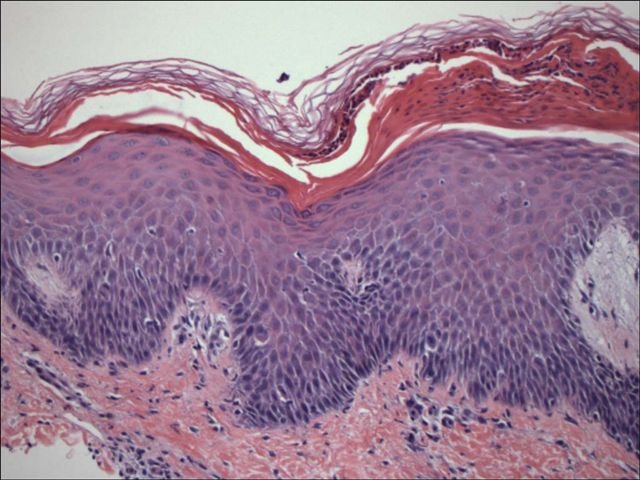 Skin biopsy revealed parakeratosis, prominent Munro’s microabscesses, focal spongiform pustule formation, and superficial and deep polymorphous infiltrate, containing multiple polymorphonuclear leukocytes, psoriasiform acanthosis, and papillary dermal telangiectasia and edema.