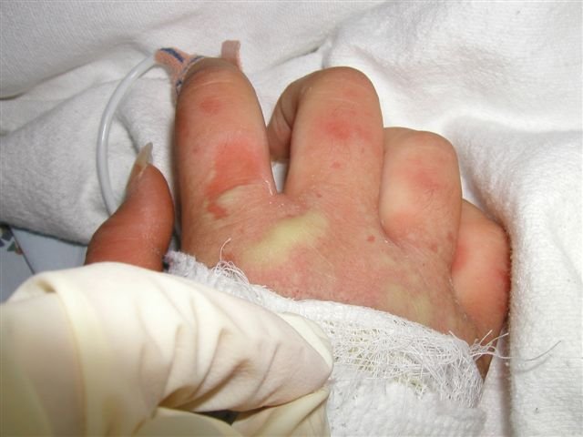 Skin: Diffusely erythrodermic with multiple pustules confluent to lakes of pus on the trunk, face, and extremities. Multiple areas of denuding skin were noted. A mild fecal odor was noted.