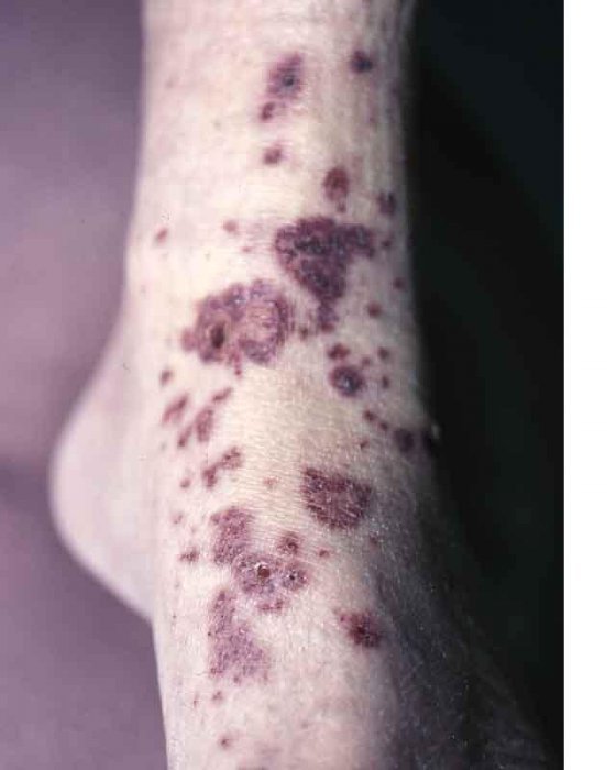 Non-specific perivascular inflammation of small arteries and veins with necrosis and fibrin deposition of vessel walls, red blood cell extravasation, thrombi, and nuclear dust. Granulomatous inflammation in the blood vessels and surrounding dermis was also noted. No atypical lymphocytes noted.