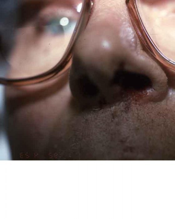 CLINICAL HISTORY: A 70-year-old white male with MI, tobacco use, hypertension, coronary artery disease, and a sedentary lifestyle presented to the clinic complaining of a sudden onset of dyspnea and cough with hemoptysis as well as a painful rash on the face, legs, perinasal area, and perioral area with ulceration. Patient also endorses congestion, hematuria, difficulty walking, and weakness. The patient had completed a course of PO prednisone approximately two months earlier due to an unspecified rash of the lower extremities.