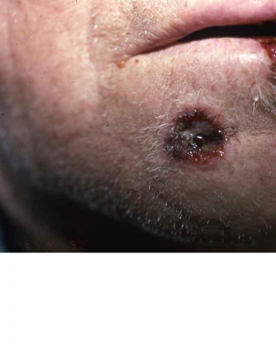 Examination of the skin revealed palpable purpura of the bilateral lower extremities. There were several erythematous nodules with shallow ulcerations of the perinasal/oral areas.