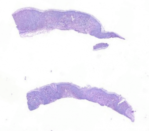 CLINICAL HISTORY: A 14-year-old Hispanic female with a history of acne vulgaris presents to our clinic with concern for a hypopigmented, atrophic patch on the left side of her neck. Per the patient’s mother, she first noticed the lesion when she took the patient to the pediatrician a few days prior to this visit. The patient tried topical benzoyl peroxide-clindamycin gel on the spot that was prescribed for her back acne. She denied itching, pain, or systemic symptoms. She also denies recent travel, sick contacts, excessive sweating, smoking, alcohol, or illicit drug use. Patient denies any personal or family history of skin cancer.
