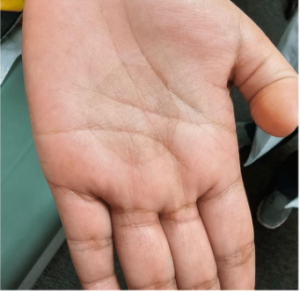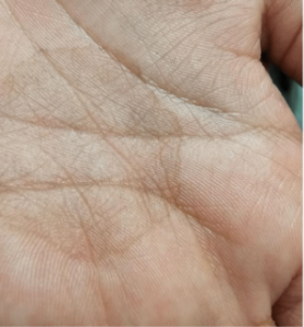 Physical examination revealed a solitary, well-defined 3 cm x 3 cm hyperpigmented patch on the palmar surface of the patient’s left hand with minimal scale. There is also a noticeably darker border.
