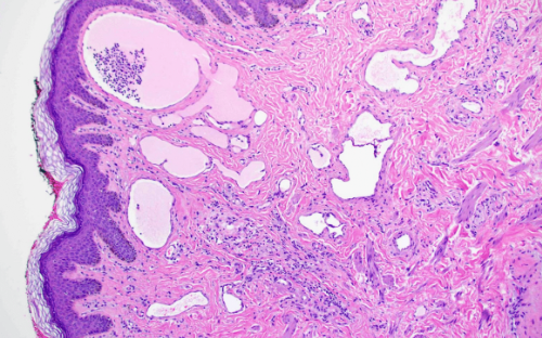 On histopathologic examination, present within the dermis are an increased number of dilated vascular spaces filled with lymph.