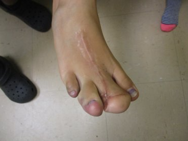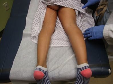 CLINICAL HISTORY: A 6-year-old female presented to our clinic with a four-month history of asymptomatic flesh-colored papules along the intergluteal cleft. The patient’s mother denied any other involved areas. The patient denies any pain, tenderness, or itching of the lesions. The patient has a past history of intellectual delay, right lower extremity hypertrophy, syndactyly of the 2nd through 4th toes on the right foot, venous malformation involving the right lower thigh, knee, and proximal calf, and lichen striatus of the left lower extremity. The papules had been previously treated with over-the-counter cryotherapy without noticeable improvement. The patient follows closely with a vascular malformation clinic in San Antonio for her diagnosis of Klippel Trenaunay Syndrome. Past surgical history includes syndactyly release of the 4th toe. The patient denies constipation, diarrhea, fevers, chills, trouble sitting or standing, unwanted sexual activity, or use of fragrance wipes. No one in the household has similar lesions.