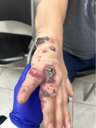 Upon skin evaluation, the patient exhibited several ulcerated, hyperkeratotic violaceous plaques and firm, subcutaneous nodules on the right hand and forearm, extending beyond the right elbow. Additionally, violaceous macules and patches were observed. There was no noticeable discrepancy in limb size, and grip strength as well as sensation were intact and equal bilaterally.