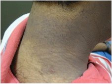 Upon re-evaluation 37 months later, the melanocytic lesion on the right frontal hairline measured 5 x 10 mm. It exhibited a deeper pigmentation compared to the initial biopsy and displayed irregular borders.