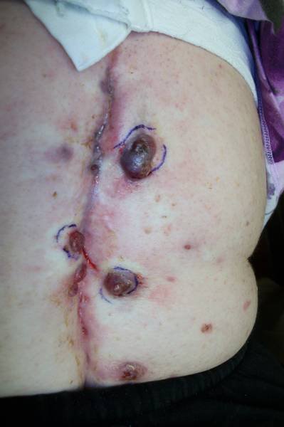 CLINICAL HISTORY: A 67-year-old Caucasian male presented to the clinic with a chief complaint of lower extremity swelling, pruritus, and pain. He also complained of discoloration of his lower extremities, right arm, and axillae, stating that one of his feet was “turning black”. Over a one-month duration, the patient noticed dark patches developing on his lower extremities, right upper extremity, and axillae. There was associated edema in his lower extremities accompanied by pain and pruritus. The patient visited urgent care, an emergency room, and his podiatrist for the chief complaint. Laboratory studies, radiographs, and an EKG were all found to be normal. The patient’s past medical history included renal transplantation in October 2010, and was maintained on mycophenolate mofetil 1g PO BID, tacrolimus 3mg PO BID, and prednisone 10 mg PO daily. Pertinent family medical history included a brother who was deceased due to malignant melanoma found in the axillae.