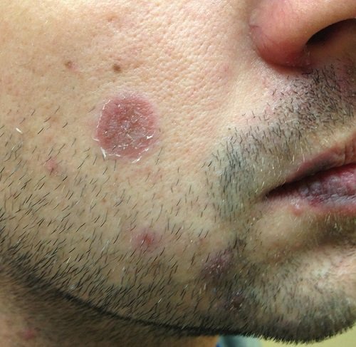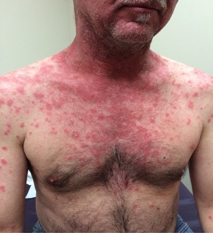 CLINICAL HISTORY: A 50-year-old Caucasian male presented with a three-day history of mildly pruritic erythematous papules and patches progressing from his head to his chest and upper arms after experiencing a sunburn during work. The patient complained of a pruritic erythematous rash from his scalp to the mid trunk. Additionally, there was erythema and hyperkeratosis of his hands and feet. The patient’s primary care provider had been treating the patch with a mid potency topical corticosteroid. The patient had a family history significant for psoriasis. He has a past medical history significant for hypertension, treated with atenolol. A review of systems was negative for constitutional symptoms.