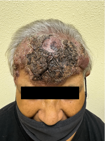 CLINICAL HISTORY: A 91-year-old gentleman with a history of hypertension, gastroesophageal reflux disease, and vitiligo presented to the clinic with two large violaceous ulcerated plaques on his left lower leg. The patient stated that a papule had formed four months prior after a ground-level fall, and it had continued to grow over the last few months, starting to bleed within a few weeks of his appointment. He denied experiencing pain, itchiness, fatigue, or other B symptoms, such as fever, weight loss, or night sweats. The patient also denied recent travel, smoking, using illicit drugs, drinking alcohol, or taking any new medications. His family history was notable for a deceased brother who had an unknown type of cancer. Current medications included carvedilol, doxazosin mesylate, isosorbide mononitrate, omeprazole, loratadine, clopidogrel bisulfate, losartan, benzonatate, and folic acid.