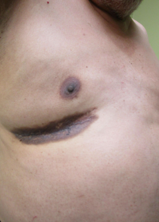 Elderly gentleman with large violaceous plaques on left shin