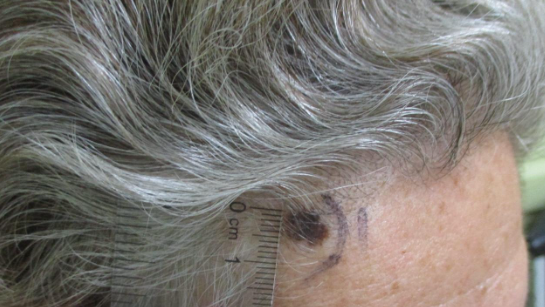 CLINICAL HISTORY: A 73-year-old female visited the dermatology clinic for a routine skin evaluation. She had no personal history of skin cancer but reported noticing changes in the appearance of some lesions. During the visit, five shave biopsies were performed. After receiving concerning pathology results, an excision was scheduled, but the patient did not return for 37 months. Upon her return at age 76, the patient was re-evaluated, and it was noted that the previously biopsied pigmented lesion on her right frontal hairline had enlarged.